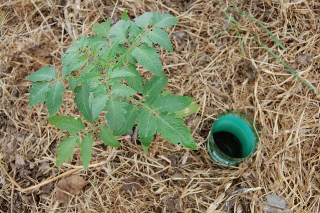 Можно закопать рядом с кустом томата обрезанную пластиковую бутылку (у меня 1,5-ка) горлышком вниз и через нее поливать. Так влажность в теплице не будет подниматься. К тому же, чтобы поливать реже, замульчируйте посадки сеной, соломой или скошенной травой. Это отличный выход из положения для «садовода выходного дня».