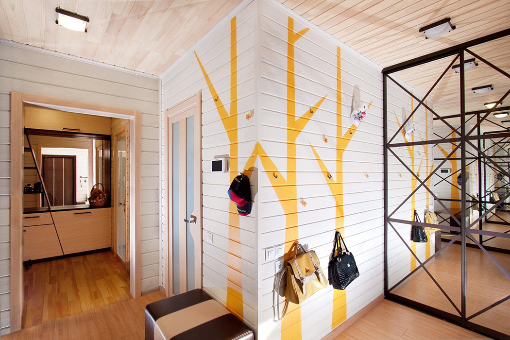 В качестве материала для отделки стен довольно часто используется дерево, которое обладает невероятно красивой текстурой и делает прихожую особенно теплой, уютной. Считается, что наиболее практичной и визуально привлекательной является вагонка. Она имеет длительный срок эксплуатации и неприхотлива в монтаже, уходе. Что касается стеновых панелей МДФ, то они имеет большое разнообразие по цвету и фактуре. Поэтому всегда можно подобрать самый подходящий вариант, исходя из выбранного стиля интерьера прихожей.