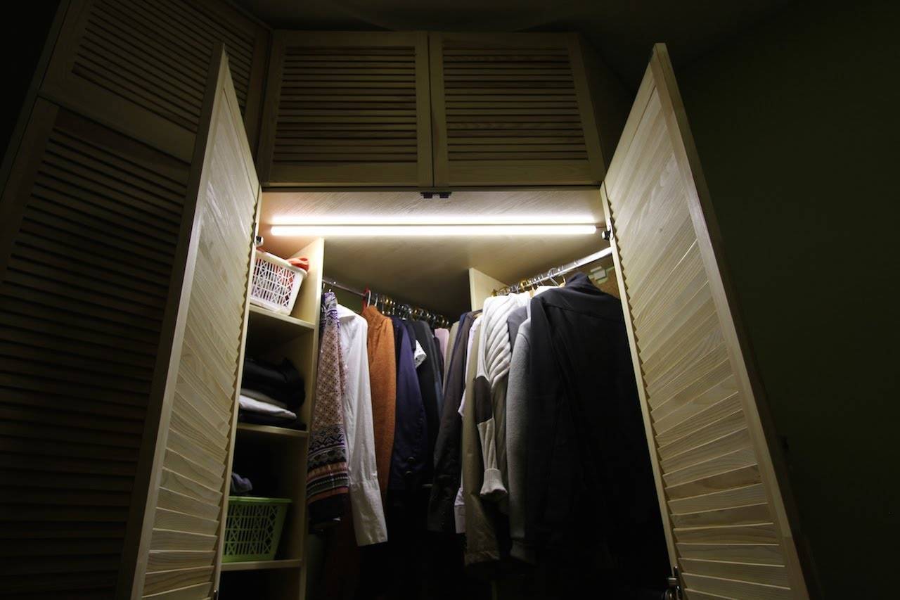 Для шкафа-купе можно прикрепить ленту так, чтобы освещение включалось при открытии. Для изменения угла освещения и чтобы визуально лучше смотрелось, а свет не бил в глаза, берется ПВХ-уголок 10х10 мм. Уголок приклеивается и уже к нему фиксируется светодиодная лента.
