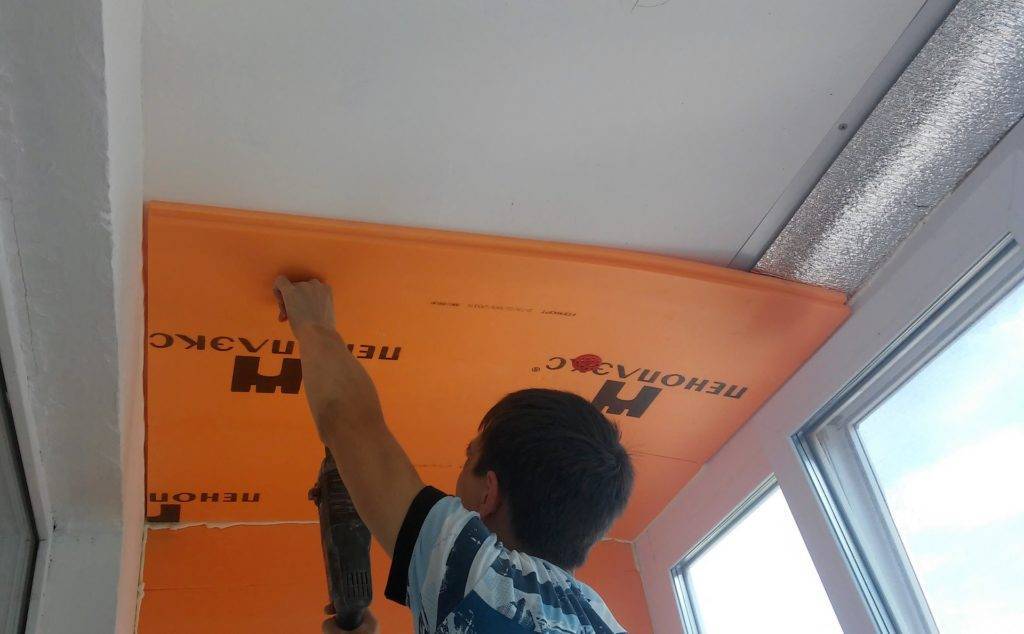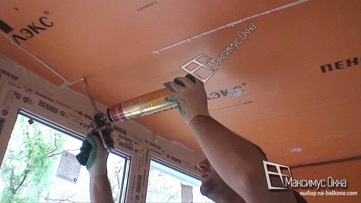 Верхняя часть балкона изолируется в последнюю очередь. Плиты теплоизоляционного материал приклеиваются к подготовленной поверхности. Для качественного сцепления рекомендуется полностью промазывать клеевым составом поверхность материала, а затем плотно его прижимать к потолку.