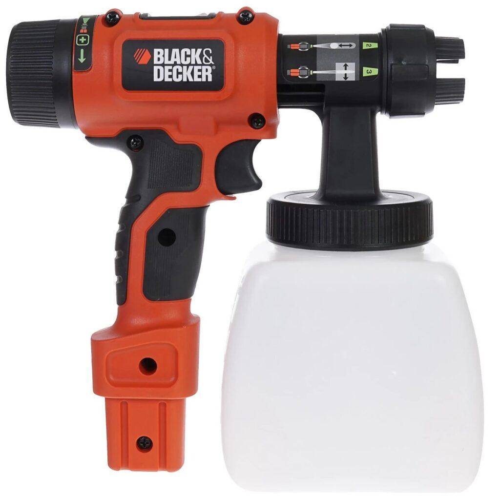 На спусковой скобе установлен регулятор интенсивности распыления. Накидная гайка позволяет оперативно менять форму факела и подстраивать инструмент под особенности окрашиваемых материалов, условий работы. Вместительный бак изготовлен из ударопрочного полупрозрачного полимера, что упрощает контроль расхода краски. Сопло и игла прилегают к каналу подачи плотно, это позволяет избежать подтеков. Стандартную насадку можно заменить на специализированные комплектующие для тонких работ.