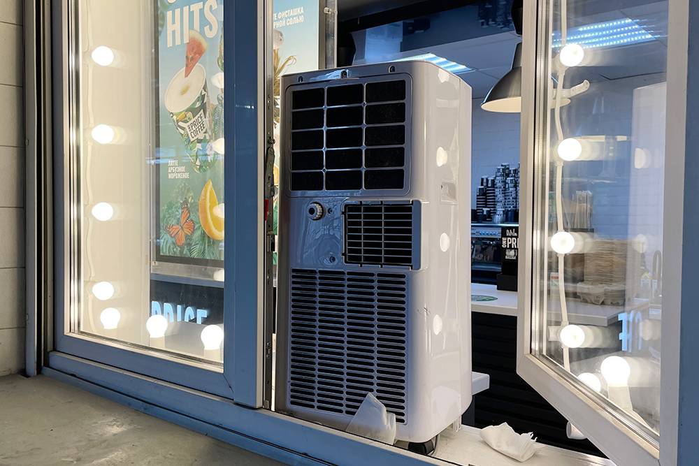 Такие устройства мобильны и не требуют вообще никакой установки — достаточно распаковать покупку и подключить ее к розетке. Правда, есть еще один существенный нюанс: нужно отводить воздух от горячего конденсатора (детали, которая обычно и занимает наружный блок). Для этого придумали воздуховод: его нужно вывести в окно или дверь. Но через щель в окне в комнату будет попадать горячий воздух! Поэтому для вывода используют вставки с отверстием: это может быть оргстекло или пластиковая шторка.