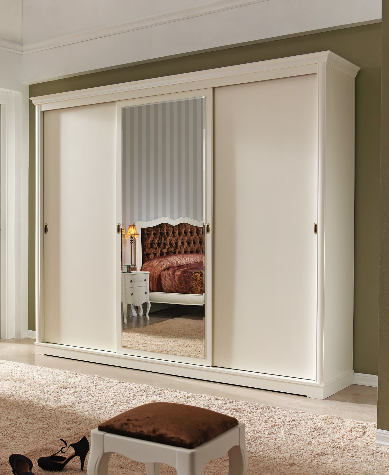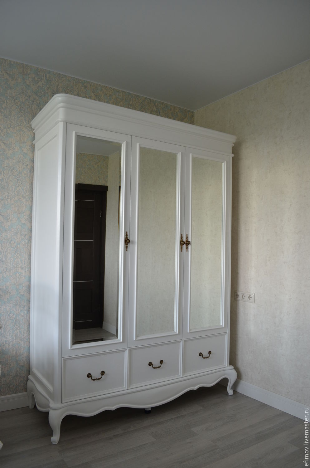выделить белый распашной шкаф на фоне остальной мебели и интерьера можно, используя текстильные обои, это создаст спокойный антураж спальни;