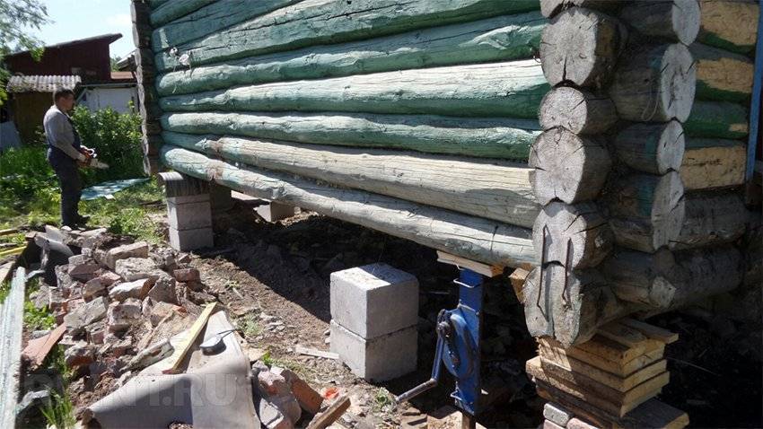 Доводим подъем до необходимой высоты. Теперь, когда все здание опущено на опорные столбы, можно приступать к вытаскиванию сгнивших бревен