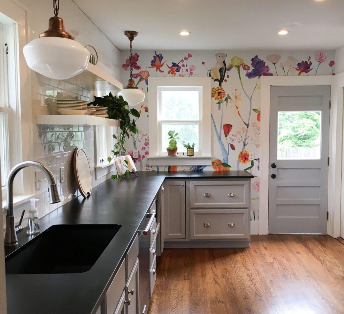 Черно-белая кухня с белыми обоями с зелеными и голубыми цветами