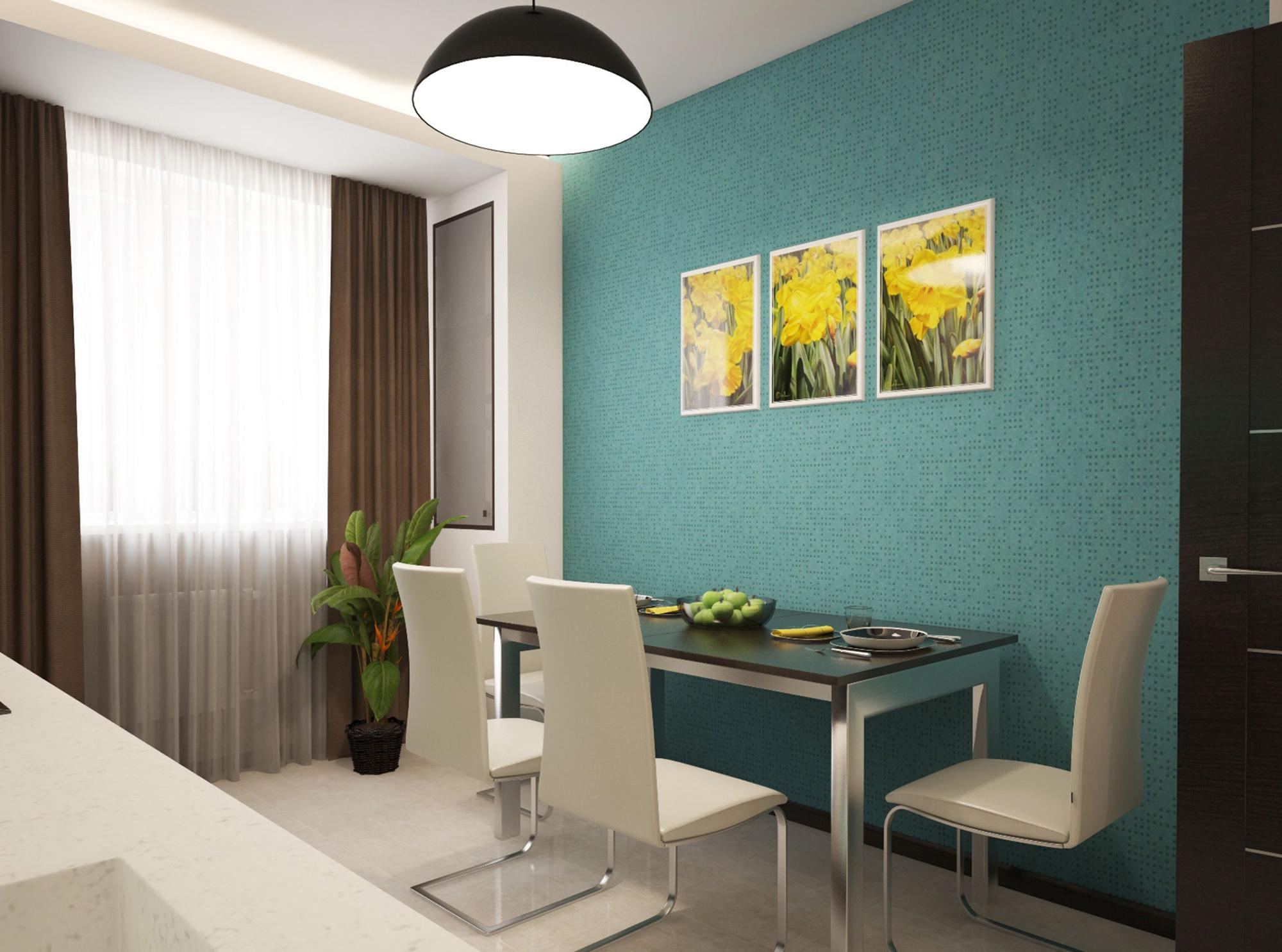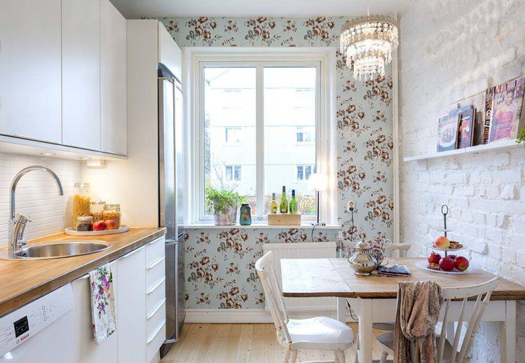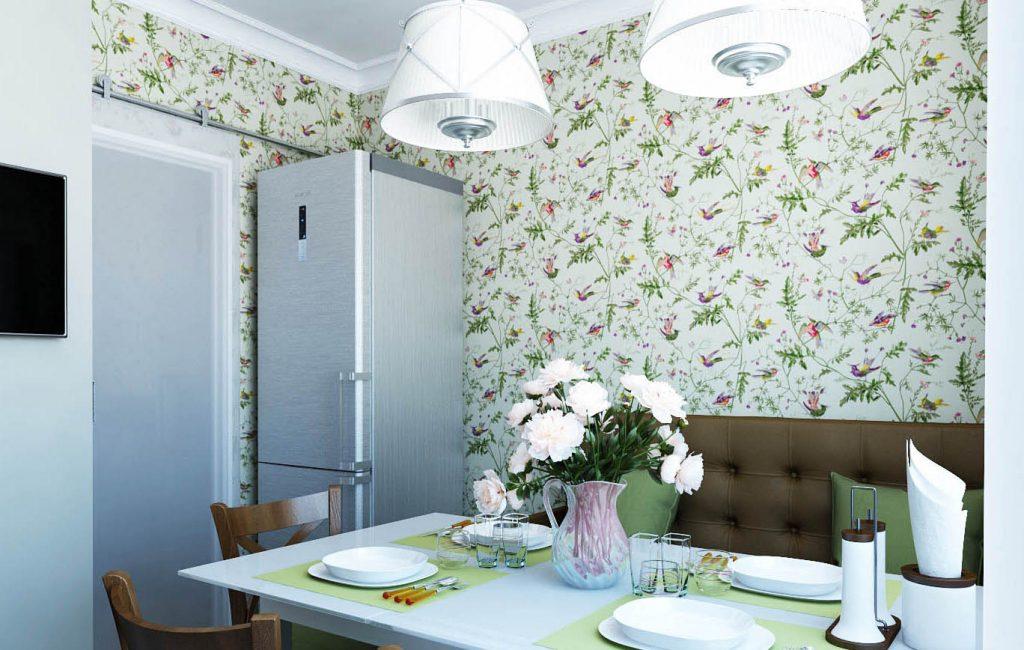 Стены, возле которых будет обеденная зона, можно оклеивать влагостойкими обоями или даже бумажными обоями.