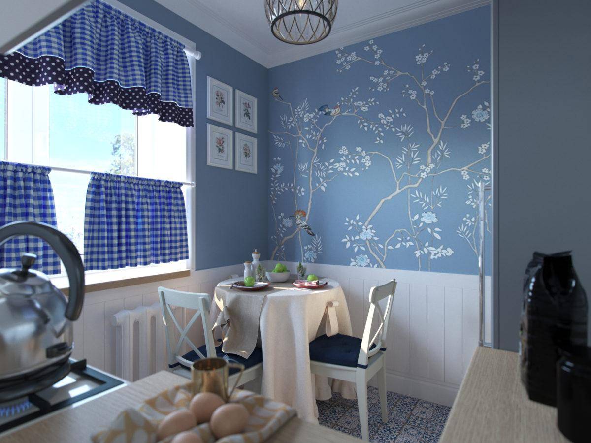 - синие или голубые обои лучше всего клеить на кухне, окна которой выходят на южную сторону, но не на север. Иначе помещение будет казаться слишком тёмным и неуютным. Гарнитур может быть чёрно-белым, из натурального дерева, бежевым, фисташковым, жёлтым, бежевым, но лучше всего синие обои подчёркивают красоту белоснежной мебели.