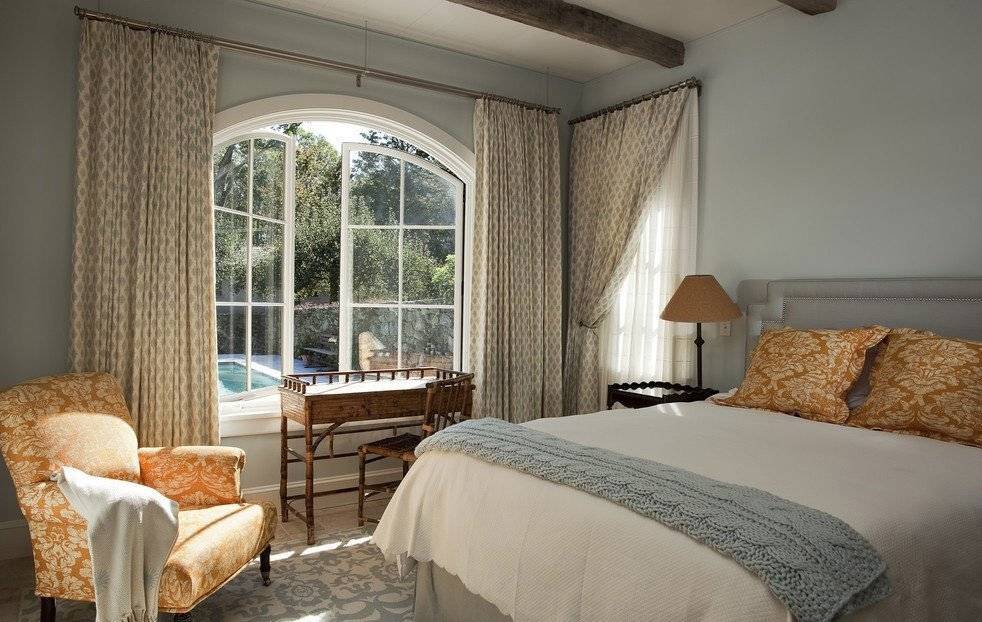 Еще один вариант, если хочется добавить темный цвет в интерьер, – это светлые шторы с крупным темным рисунком.