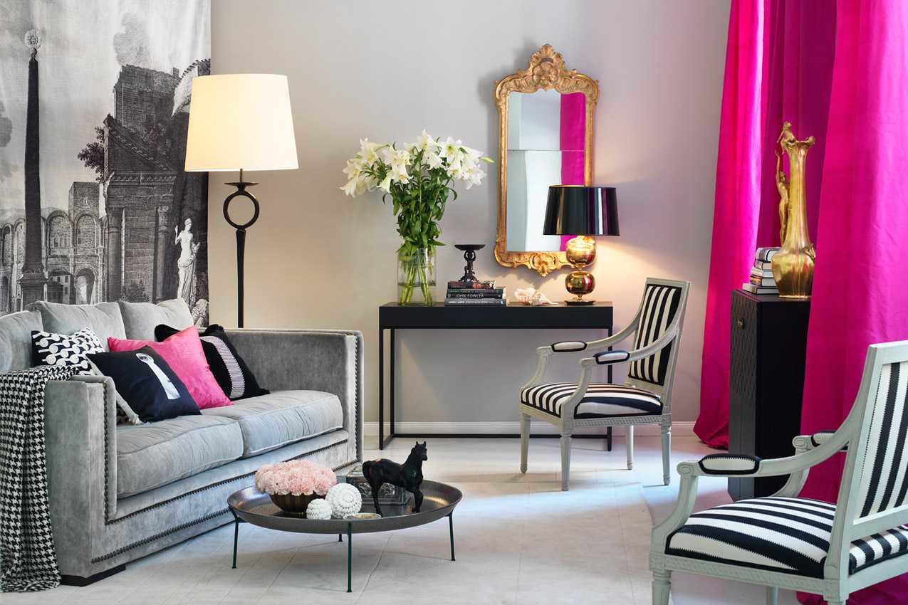 - Розовый всех возможных оттенков прекрасно сочетается с серым. Такое сочетание цветов может подойти не только для гостиной, но и спальни, особенно если это серый и пудрово-розовый или даже фиолетовый.