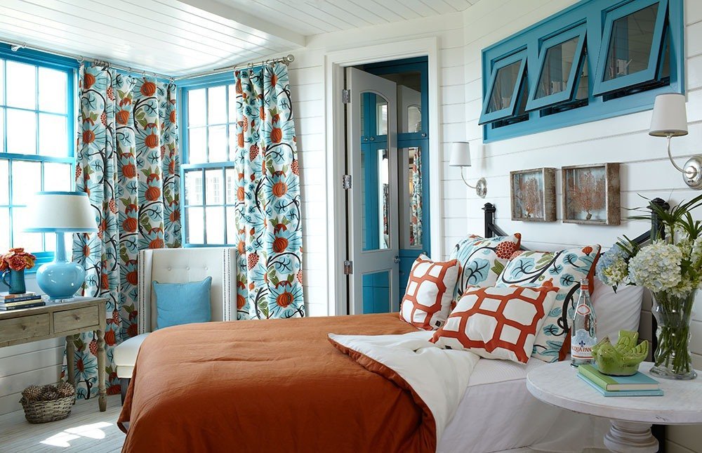 - Синий. Все вариации синего прекрасно сочетаются с холодной базой: ультрамариновый, сапфировый, бирюзовый. Потрясающий эффект дают занавеси с рисунком, который соединяет в себе сразу несколько вариаций синего. Данный вариант уместен в спальне, гостевой и кабинете.