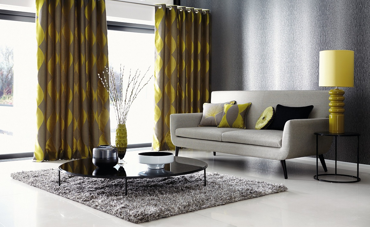 Если вы хотите подобрать шторы к серым обоям в интерьере гостиной, то обязательно обратите внимание на это сочетание. Данная комбинация добавит комнате динамичность, правда цвет текстиля не должен быть излишне броским, в противном случае он будет раздражать и давить.