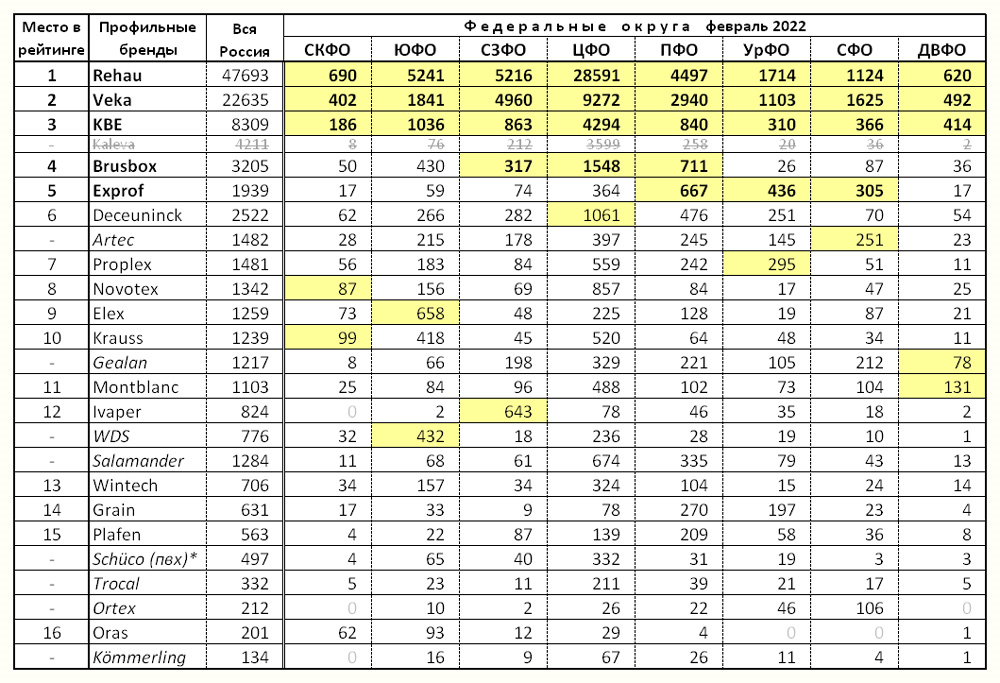 Пять наибольших значений в каждом федеральном округе подсвечены желтым. Соответственно марки профилей ранжированы в порядке убывания количества федеральных округов, где они входят в топ-5, и убывания суммарного числа запросов, если количество округов совпадает. Позиции (места в рейтинге) пронумерованы без учета марок, которые не упомянуты в рейтинге крупнейших производителей. Это сделано, чтобы оба рейтинга можно было сравнивать.