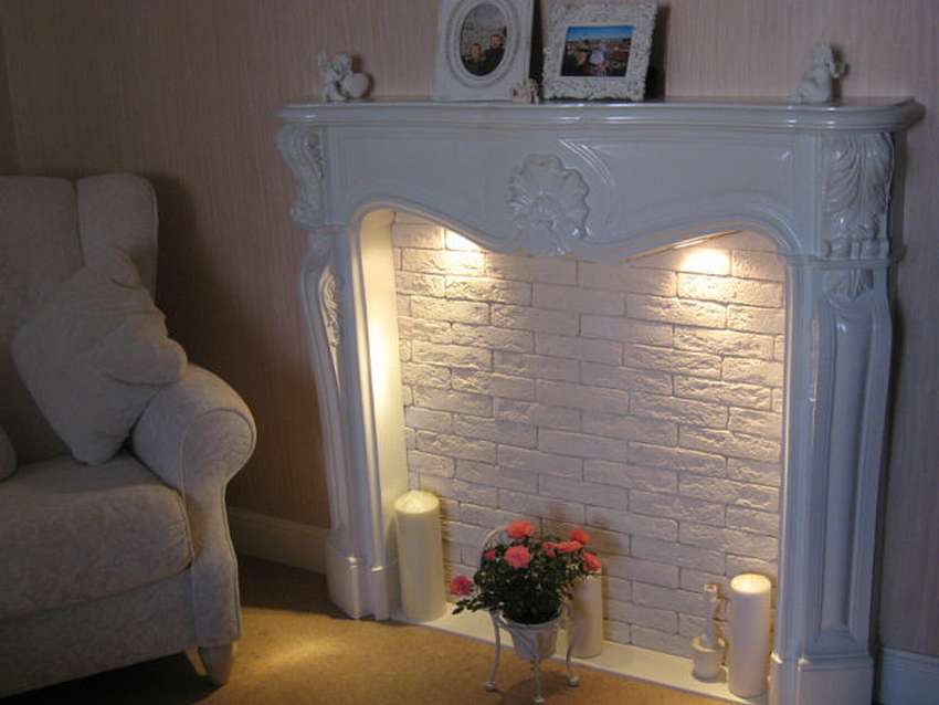 Пристенный фальш-камин может быть выполнен «под кирпич», «под старину» и др. Многие предпочитают традиционный вид очага в белом цвете.