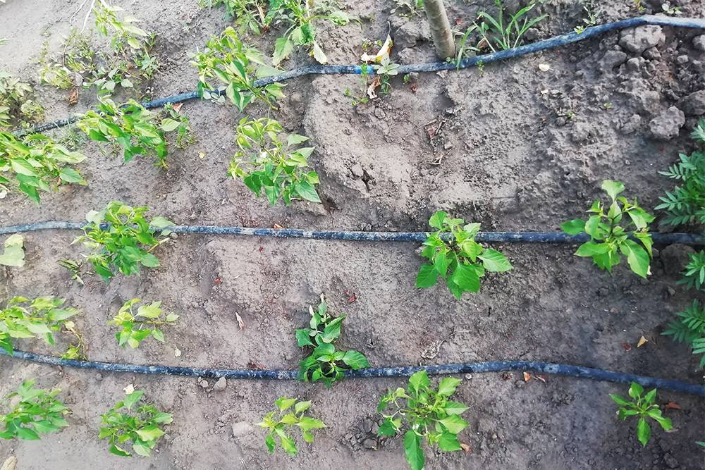 Шланги для капельного полива располагаются на поверхности почвы или в ее верхнем слое, рядом с корнями растений, что обеспечивает их оптимальным количеством влаги. Благодаря большой влажности почвы, растения дополнительно защищены от ранних заморозков.