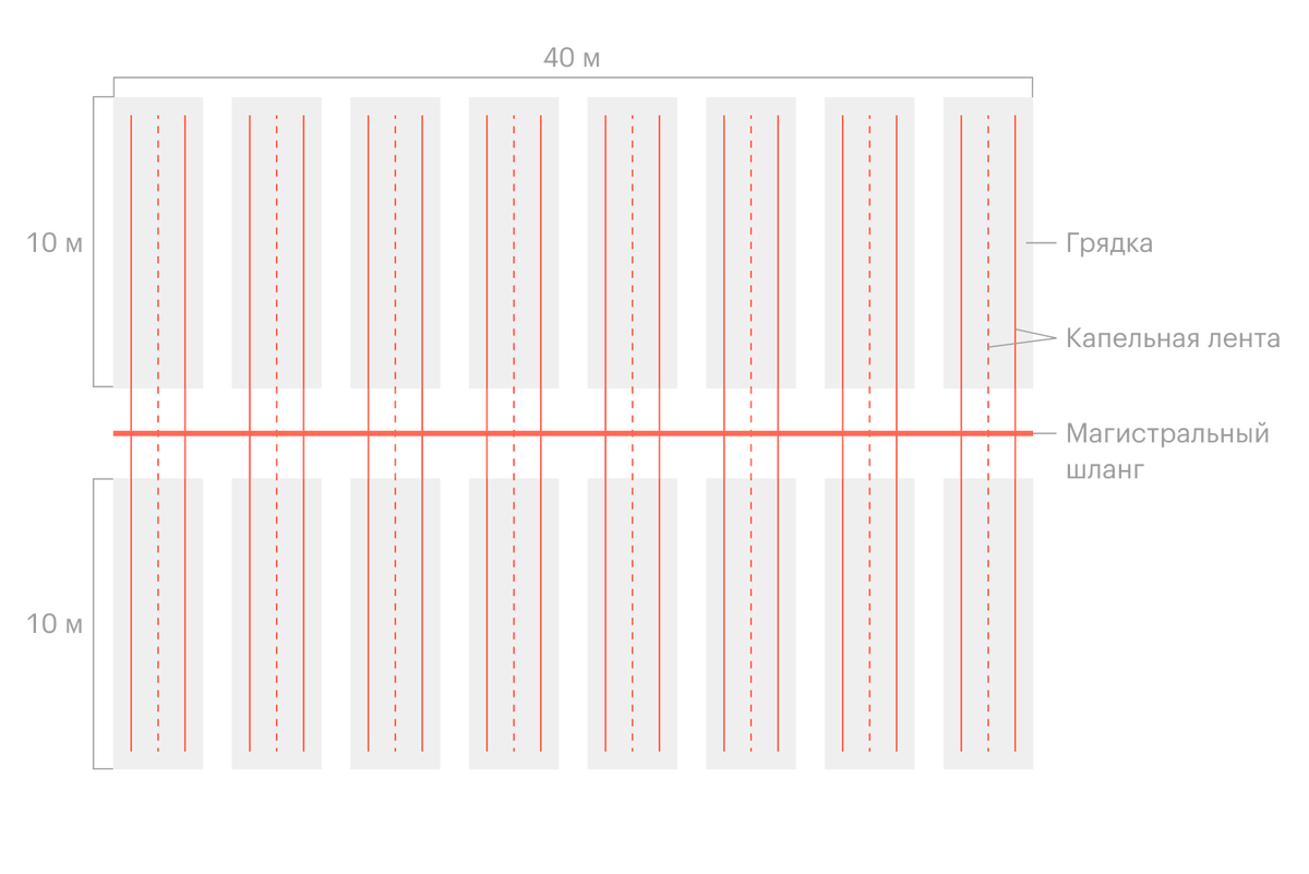 16 грядок × 2 капельные ленты × 10 м длина грядки = 320 м