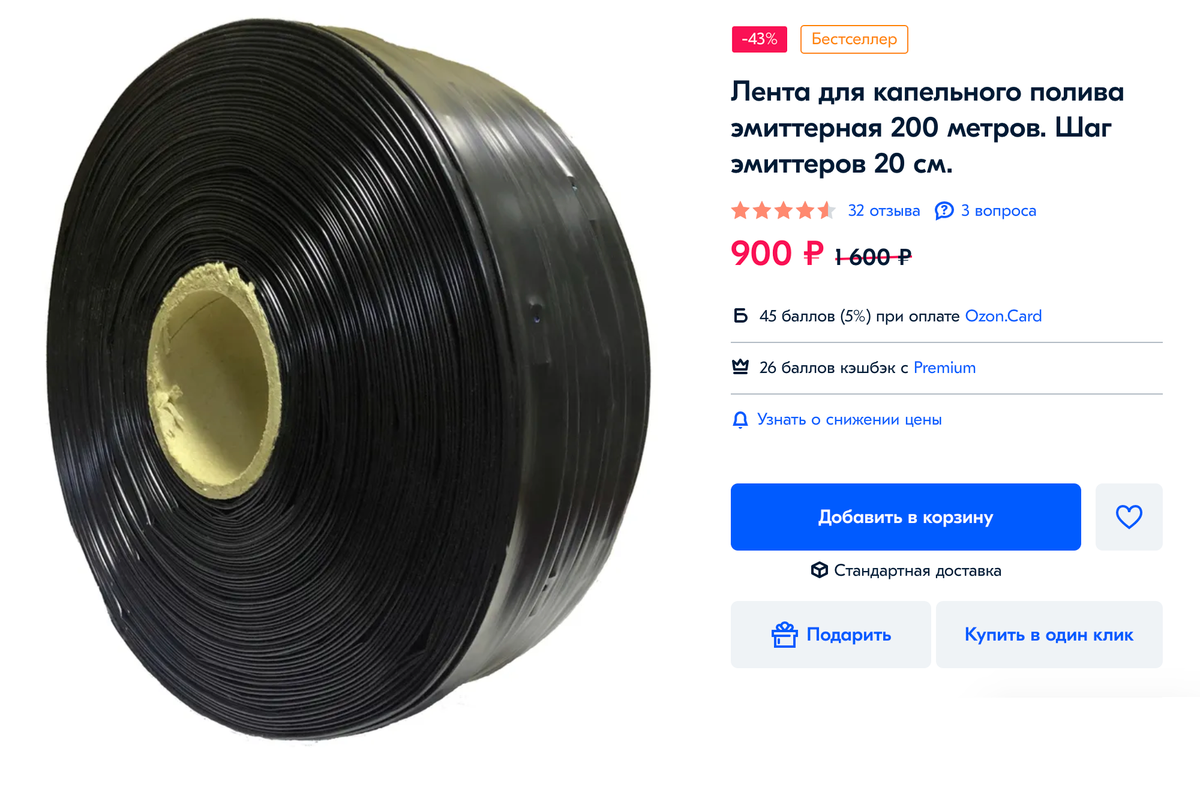 Расстояние между эмиттерами может быть разным. Для некоторых культур, которые посажены далеко друг от друга, подойдет лента с расстоянием 30 см. Я выбрала ленту с частым расположением эмиттеров — каждые 20 см.