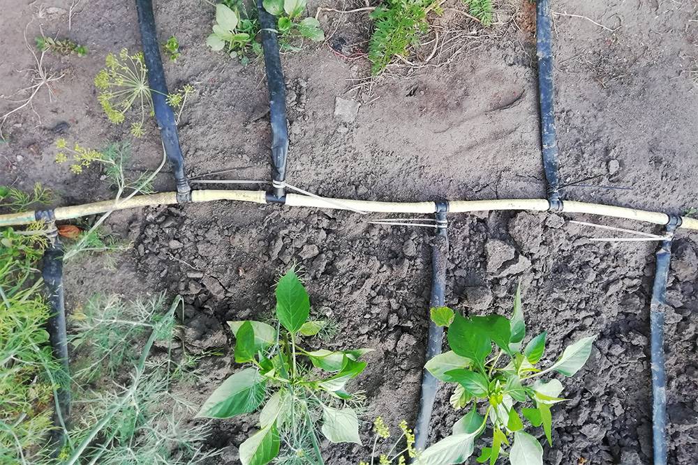Но в магазинах я не нашла такой трубы, а заказывать ее было дорого. Поэтому в качестве магистрали я использовала самый обычный и самый дешевый поливочный шланг диаметром ½ дюйма — покупала его еще в 2013 году примерно за тысячу рублей. Я разрезала его на кусочки, между которыми вставила Т-образные фитинги. На верхний и нижний конец я закрепила магистральный шланг, а на боковой отвод — капельную ленту. Крепила обычными пластиковыми стяжками.