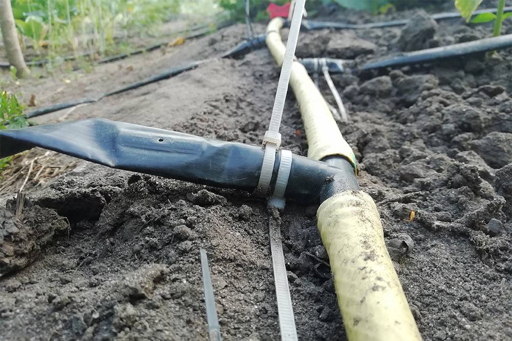 В местах отвода линий необходимо присоединить тройники. А уже к их боковым выходам подключать капельные шланги или ленты. Для этого также необходимо приобрести переходники. Они крепятся при помощи хомутов из металла.