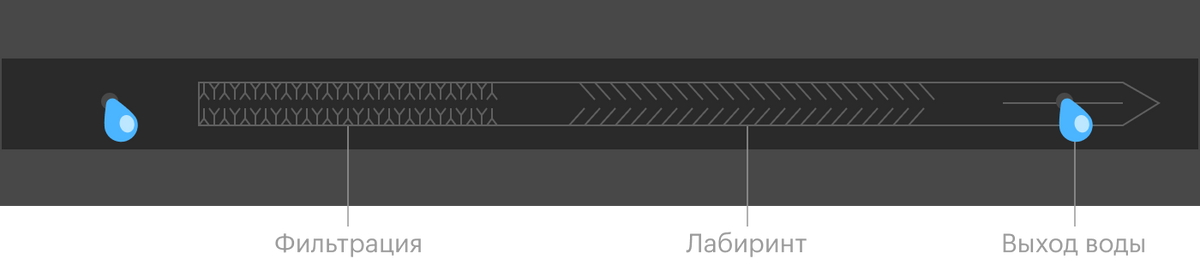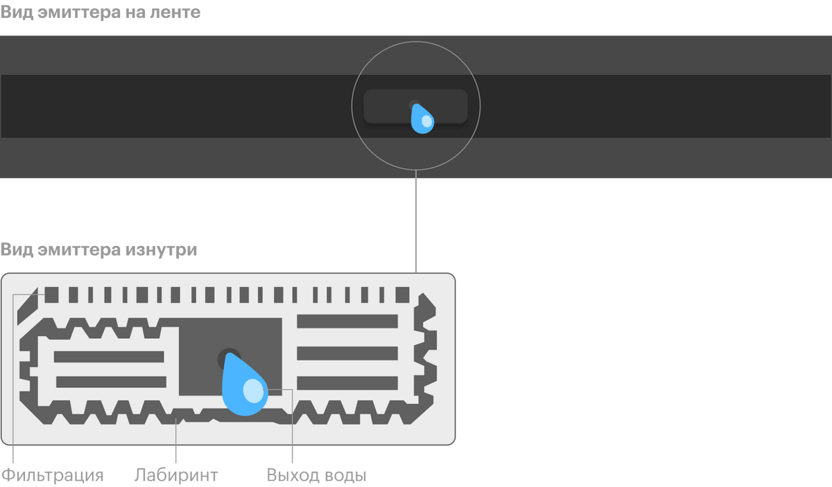 Эмиттер устроен по принципу лабиринта для воды. Она попадает в сеть запутанных микроканалов — это обеспечивает равномерность полива и меньшую зависимость от давления, чем если бы вода выливалась просто в щели на шланге