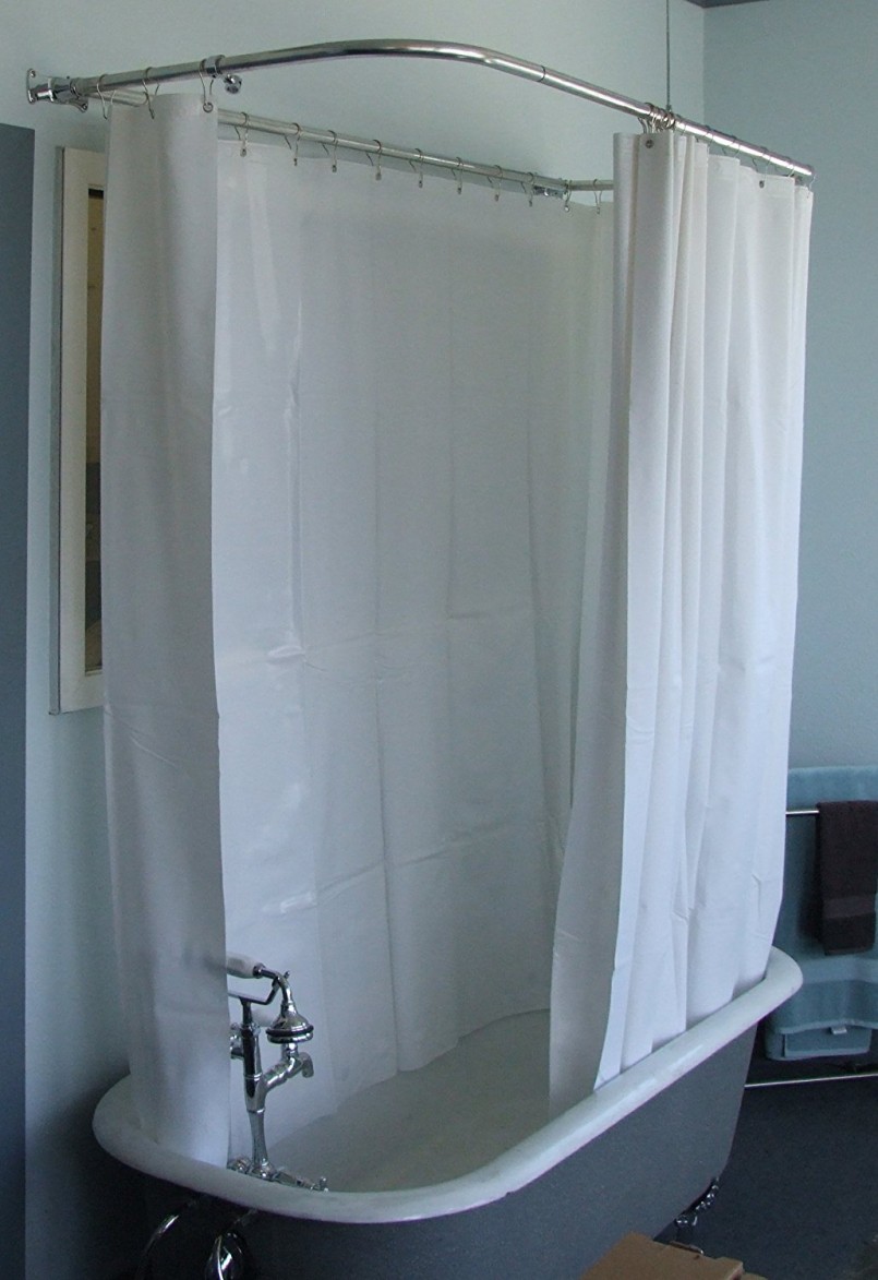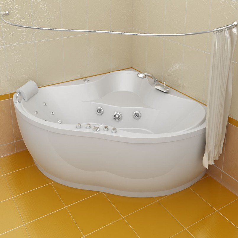 Некоторые угловые карнизы имеют форму дуги, то есть углы полностью отсутствуют, но несущая труба плавно изогнута. Такие устройства больше всего подходят для ванн асимметричной формы, находящихся в углу или в нише.