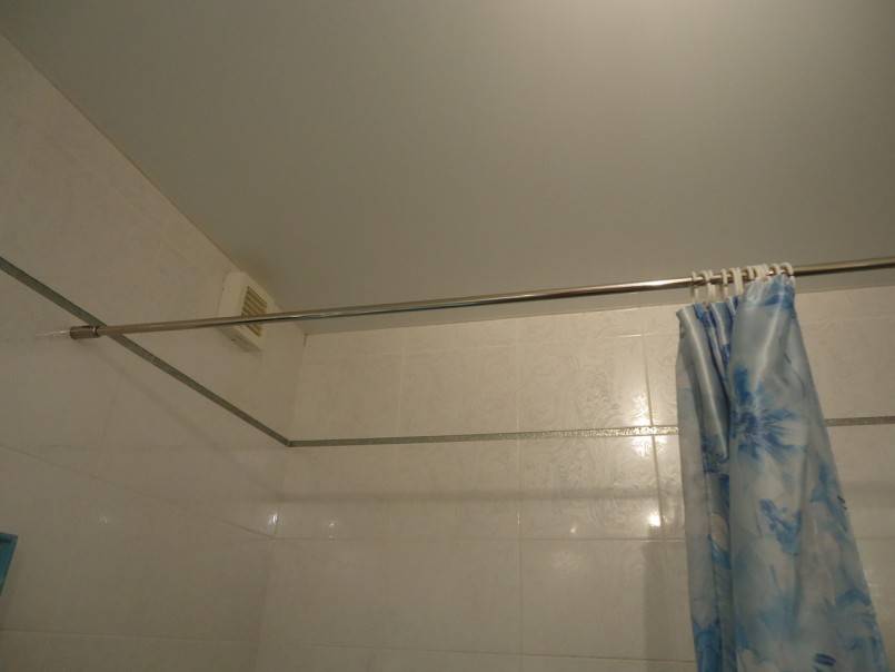 - Определите место крепления. Проследите, чтобы оно было не слишком низко, однако соблюдайте отступ от потолка (15-20 см). Проверить можно по шторке – ее край должен свободно ниспадать внутрь ванны, а не находится над ее краем.