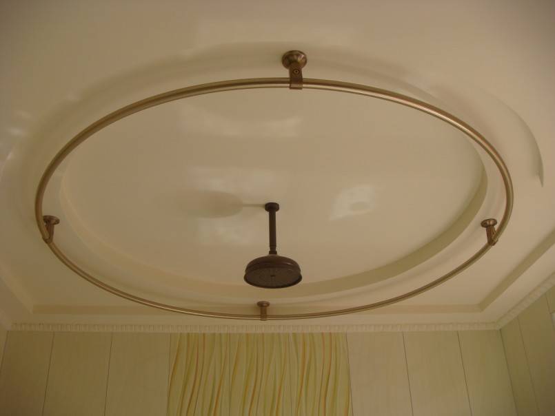 Фантазия пригодится, если ванна установлена в центре комнаты. Существуют оригинальные приспособления, которые фиксируются на потолке и имеют различный вид – представляют собой раму круглой или прямоугольной формы.