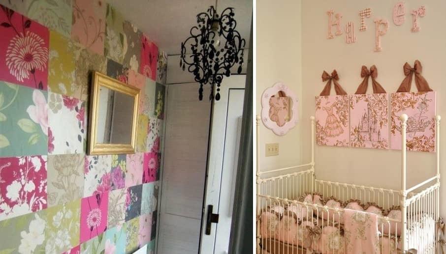 В этом помещении особенно хороша техника лоскутной аппликации – стены также можно украсить цветочными или геометрическими орнаментами. Для этого можно использовать остатки старых обоев, или же можно выбрать в магазине подходящий по фактуре и рисунку рулон. Иногда устраиваются распродажи обоев, которых осталось мало, а для декора одного рулона, как правило, бывает достаточно.