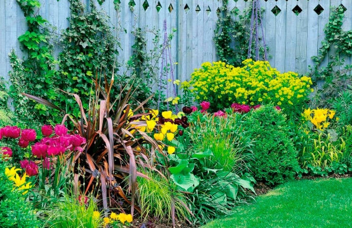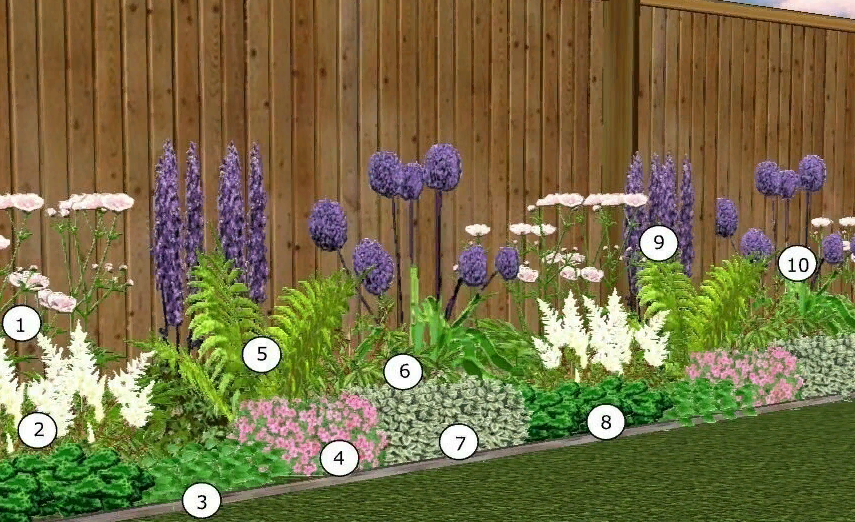 У ограды из штакетника высаживают высокорослые растения, вроде мальвы, лианы, гортензии. По периметру размещают средне- и низкорослые тенелюбивые цветы. Садоводы часто используют петунию, лобелию и бархатцы. Также принято высаживать и небольшие кустарники, вроде малины, сирени или жимолости.