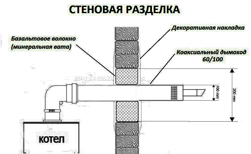 - Выход из стенки. Приспособление, которое предназначается для газового котла, должно выступать из стенки не менее, чем на 20 см.