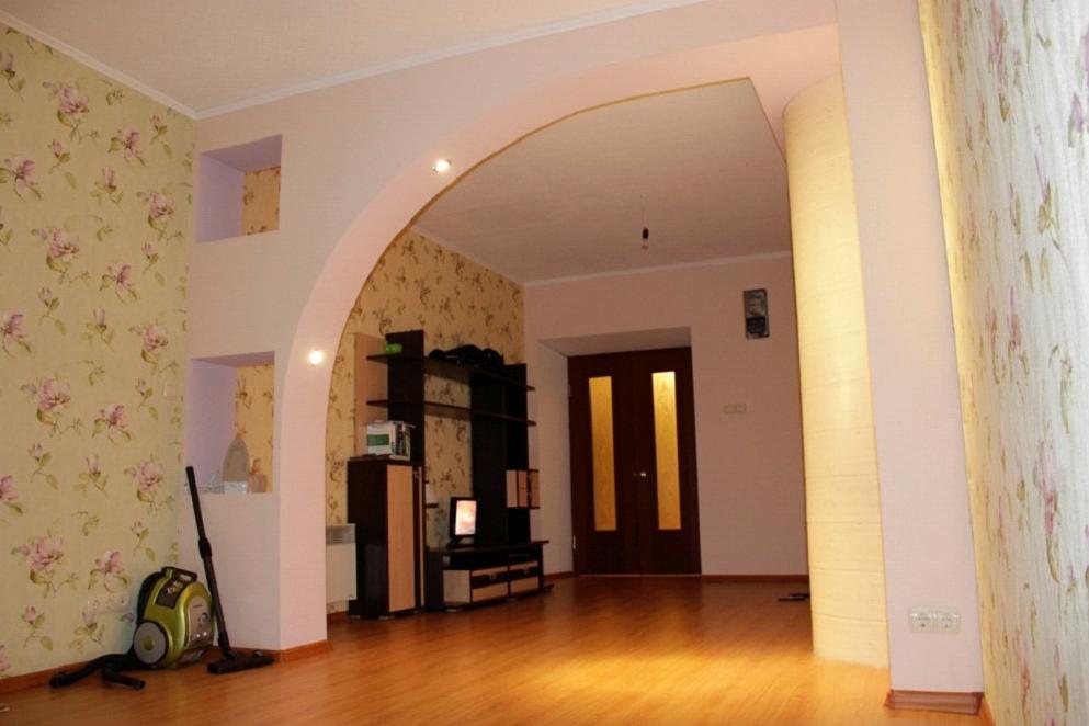 Если принято решение воспользоваться аркой с колоннами, то предварительно расширяется стандартный дверной проем, так как ширина должна превышать 80 см, а для двух колонн дополнительно закладывается не меньше 50 см.