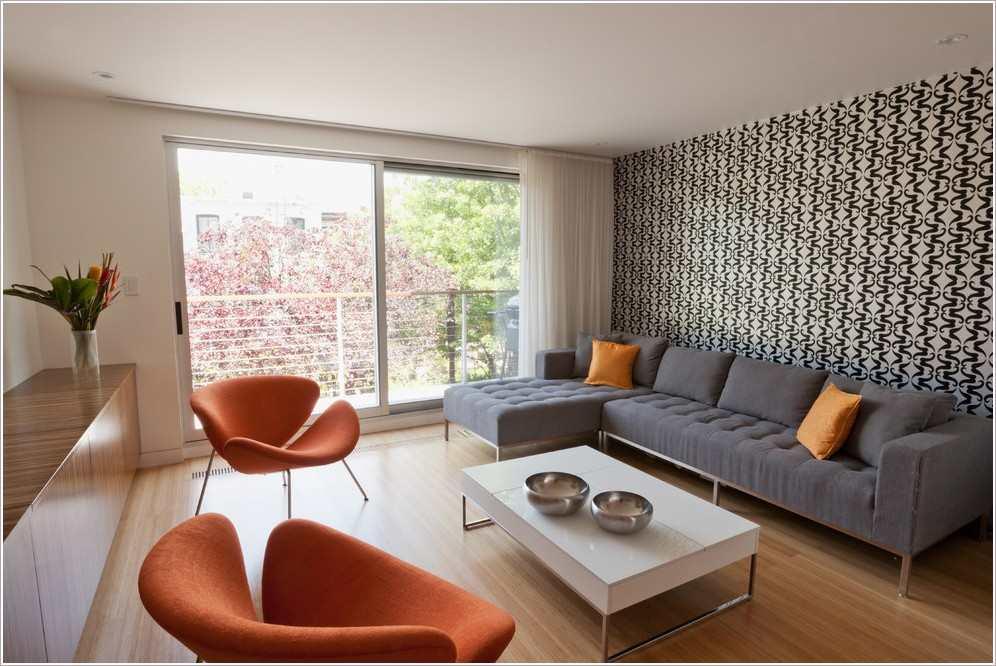 Комбинирование однотонных обоев и обоев с орнаментом в интерьере гостиной