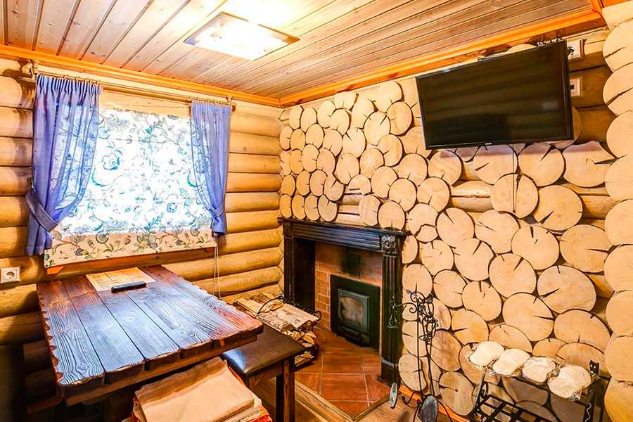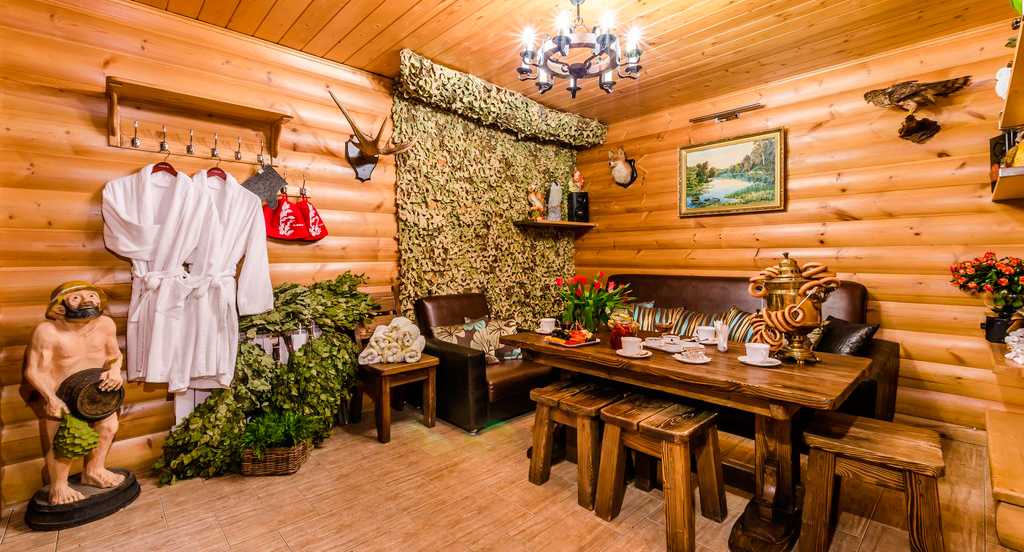 При оформлении комнаты отдыха бани в русском стиле используют только натуральные материалы, которые насыщают пространство приятным ароматом. Включают приглушённый свет, создающий атмосферу, располагающую к спокойствию и полному расслаблению. Часто устанавливают камины или маленькие печи. На столах стелют скатерти, нередко ставят классический русский самовар и прочие элементы декора. Человек чувствует себя, как дома.