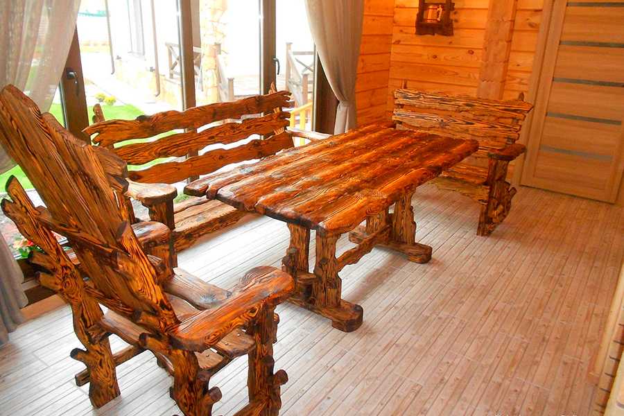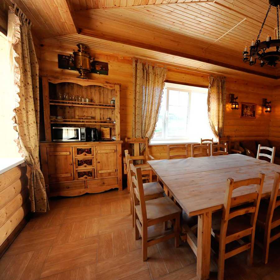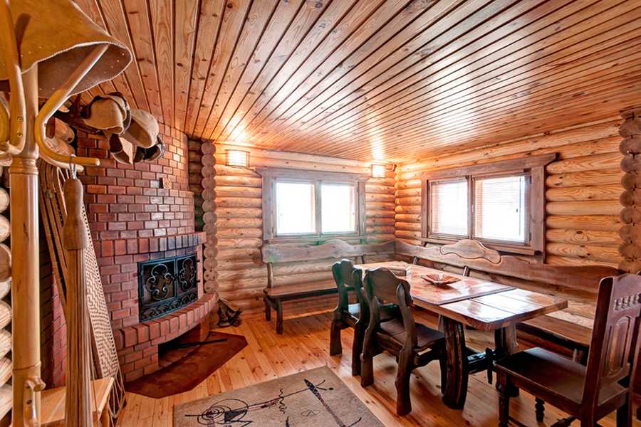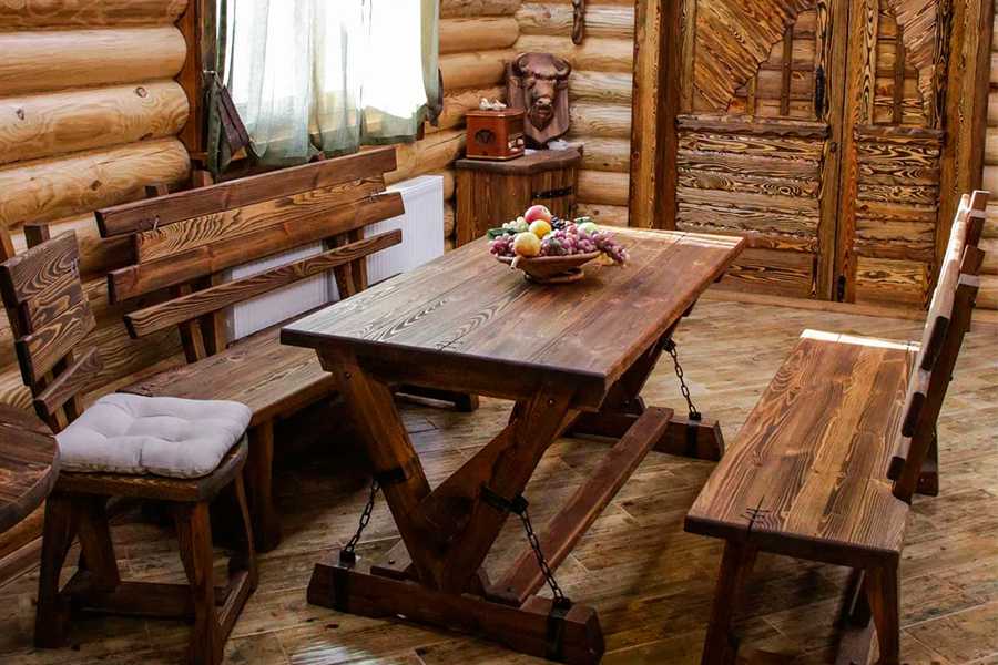 Хорошим центром помещения может стать большой стол, идеально, если он будет массивным, например, дубовым. Стулья и скамьи могут располагаться вокруг него. Грубоватость такого интерьера можно сгладить, используя ковровые дорожки, скатерти, занавески, красивые вышитые полотенца и другое.