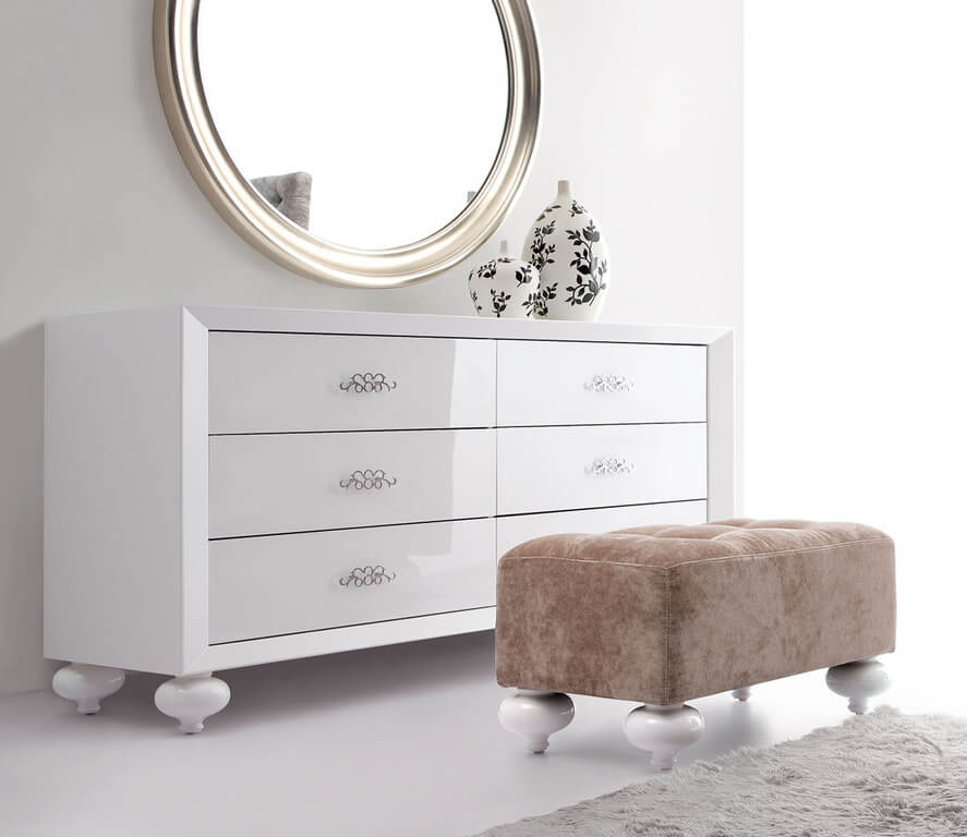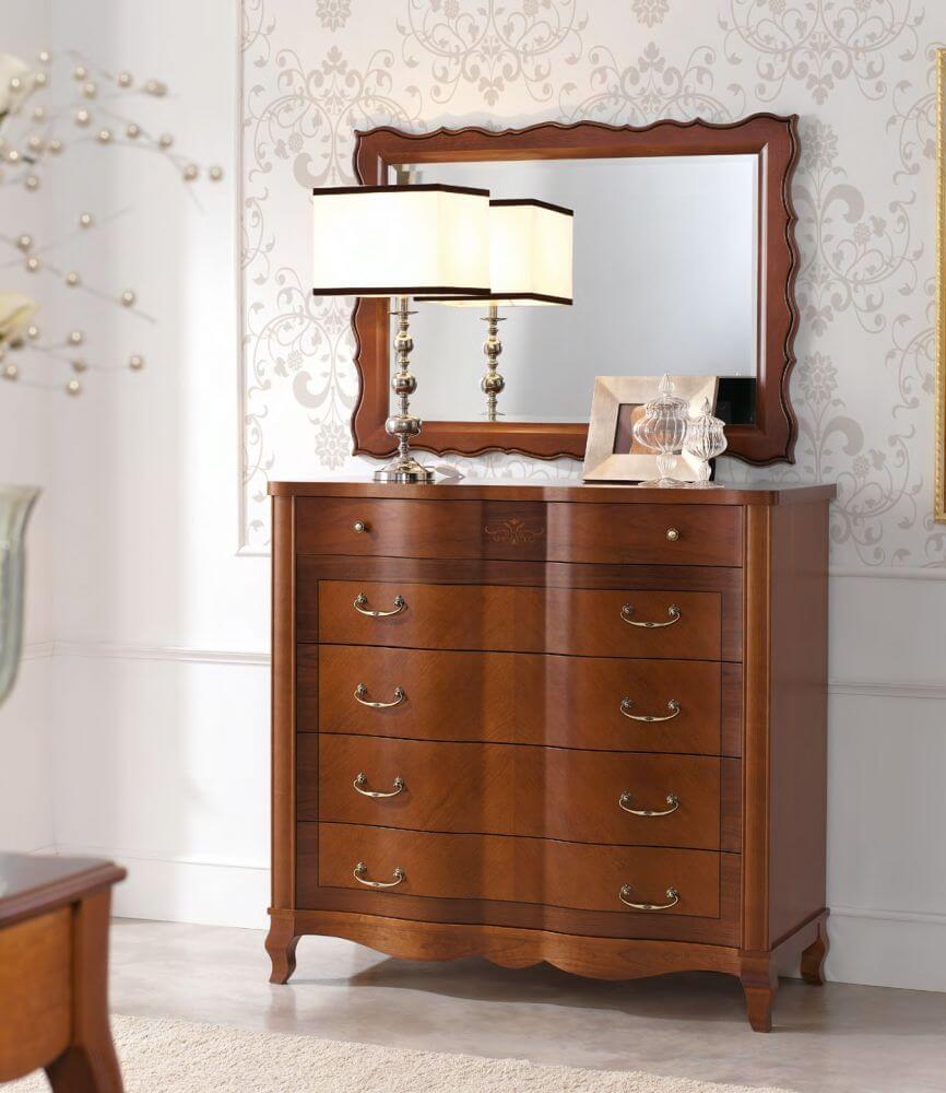 Для классического стиля выбирайте рамы и комоды из элитных пород дерева, не брезгуйте резьбой и орнаментами, даже рельефами, дополняйте дизайн несколько вычурными деталями: витыми ручками и изогнутыми линиями декора. В цветовом решении придерживайтесь коричневой или мягкой кремовой гаммы.