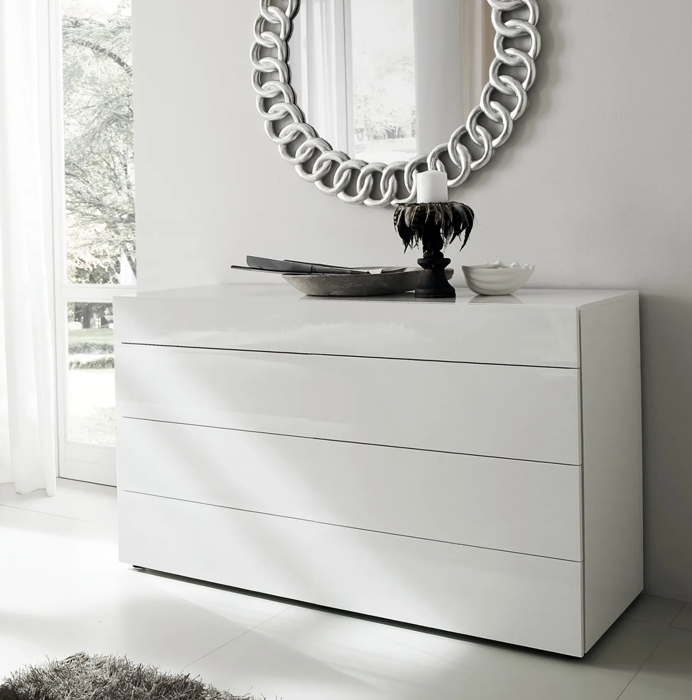 Цветное стекло, которое многие выбрали для фасада гардероба, будет красиво смотреться как дверь комода, стеклянная верхняя часть или только передняя часть ящика. Если это графический акцент на стекле или пескоструйный элемент, то его отображение на передней части комода придаст мебели легкость и характер.