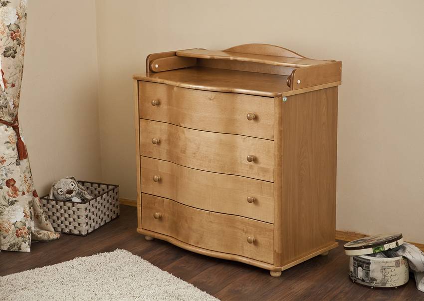 С пеленальным столиком, являющимся хорошим выбором молодых родителей. Столешница легко раскладывается, а специальные бортики предотвращают падение малыша. Она же может использоваться для хранения вещей и игрушек.