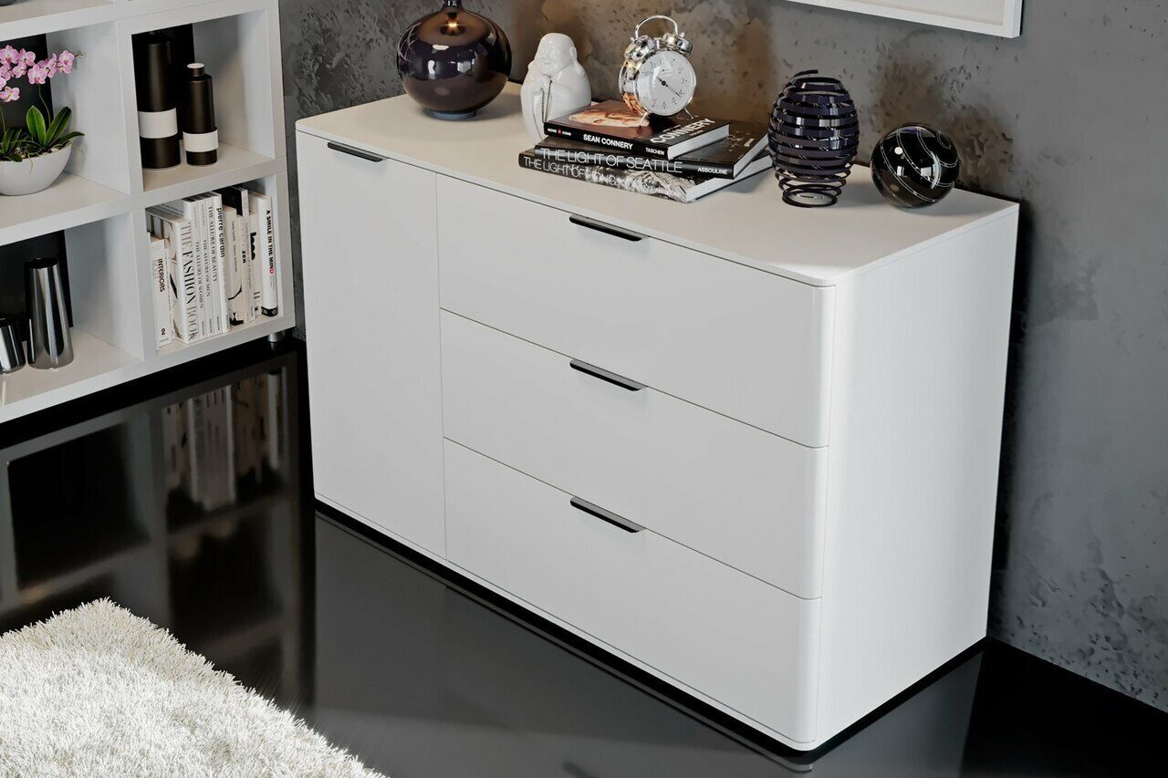 - Глянцевые белые, серые, черные комоды в современном стиле с металлическими элементами для стиля хай-тек или минимализм.