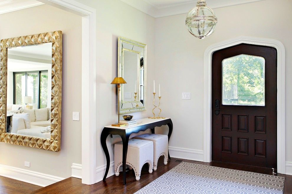 Для просторной прихожей отлично подойдет массивная консоль с большим зеркалом дополненная креслами