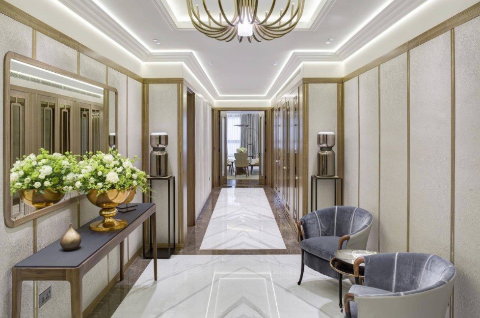 Столик с ящичками в стиле ар-деко в просторной прихожей