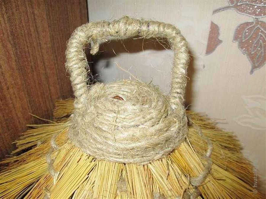 На горлышко бутылки, при помощи мучного клейстера, крепятся пучки соломы: