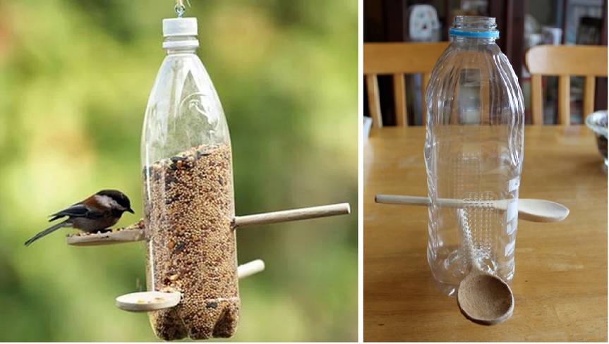 Необычная конструкция с ложками понравится маленьким птичкам, а заодно удивит и вдохновит соседей. Из материалов понадобится двухлитровая бутылка и 2 простые деревянные ложки, желательно с длинными ручками (не менее 20 см):