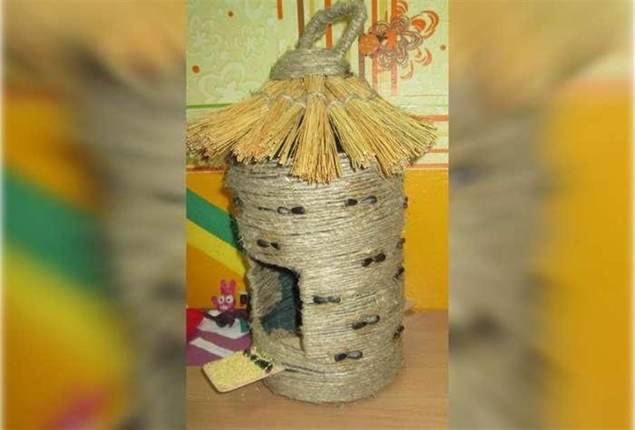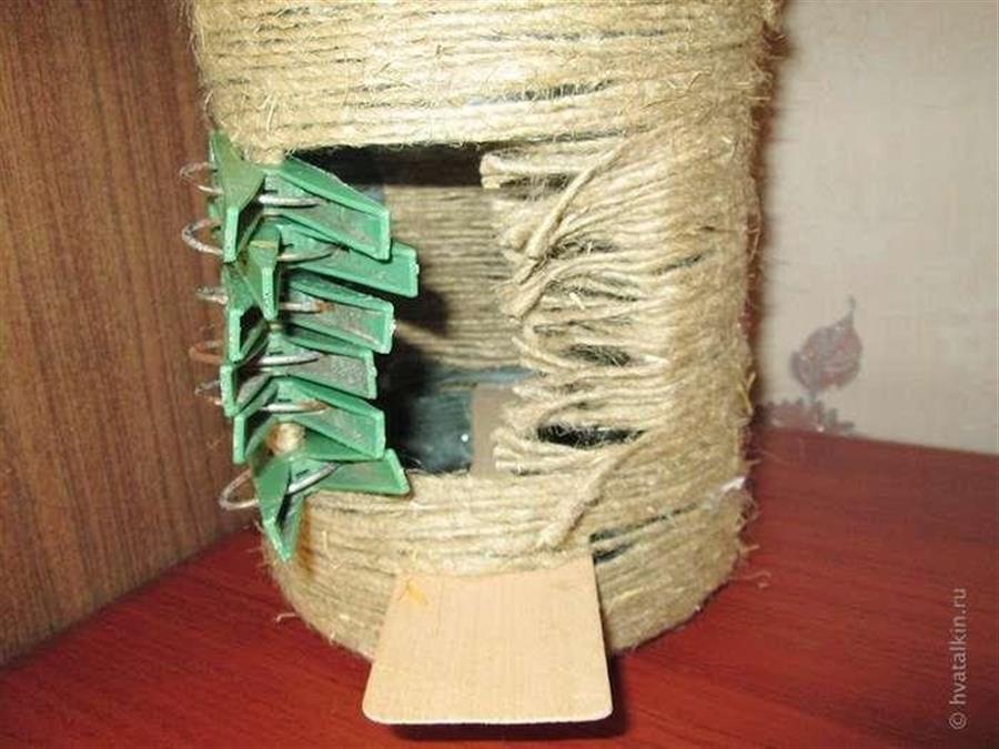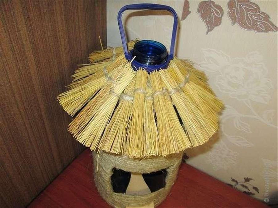 Бутылку по всей поверхности обмазать клеем, а затем обмотать бечевкой, чтобы не осталось просветов. Прутья из веника равномерно разместить у горловины, недалеко от крышки, и крепко перевязать бечевкой. Когда изделие просохнет от клея, поверх бечевки можно нарисовать красивые резные окошки.
