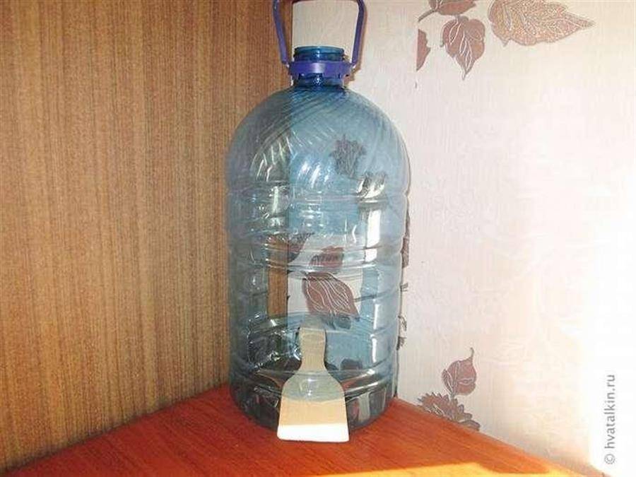 - из верхней части 20-литровой бутыли делается козырек: в ней по центру вырезается отверстие для надевания на кормушку;