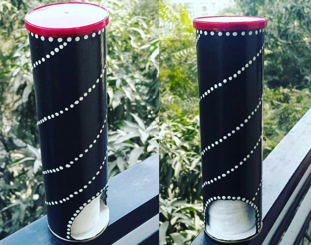 Следующий вариант того, “Принглс”, пригодится девушкам. Банку без особого труда можно переделать в диспенсер для хранения и подачи Что для этого понадобится? Да по сути, ничего необычного: канцелярский нож, карандаш, немного разноцветной упаковочной бумаги, клей и пачка ватных дисков.