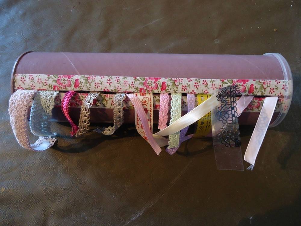 Чистую коробку от чипсов оклейте декоративной тканью так, чтобы стыки были не видны. Сделайте небольшой бортик, загнув полоску картона уголком. Приклейте его. В центральной части сделайте разрез шириной примерно 1 см. Вставьте ленты или катушки от ниток в банку. При необходимости их можно разделить картонными перегородками.
