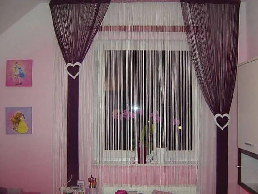 В дизайн маленького окна гармонично впишется кисейная штора. Модели в виде нитей не отягощают интерьер, визуально делают компактный проем крупнее. Дизайнеры рекомендуют использовать варианты из мелких пластиковых бусин (круглых, цилиндрических), собранных на леске.