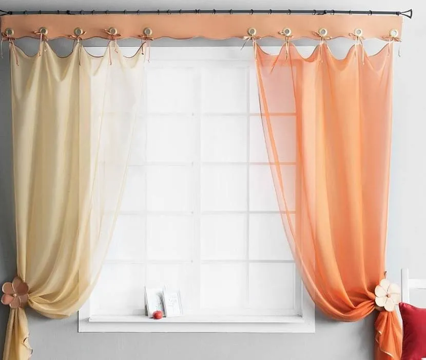 Персиковые цвет. Такую расцветку стоит подбирать к оливковым, фисташковым, белым или бежевым стенам. Для придания атмосферы уюта необходим тюль, который будет светлее на несколько оттенков.