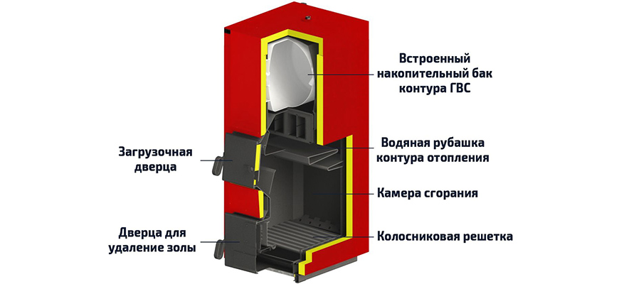 Основу конструкции составляет топка, состоящая из портала для загрузки, колосников для организации воздухоподачи и зоны дымоотведения. Зола собирается в отдельную емкость. Для теплообмена предусмотрена водяная рубашка, в которой циркулирует жидкость. Терморегуляция и контроль нагрева выполняются заслонкой и шиберами.