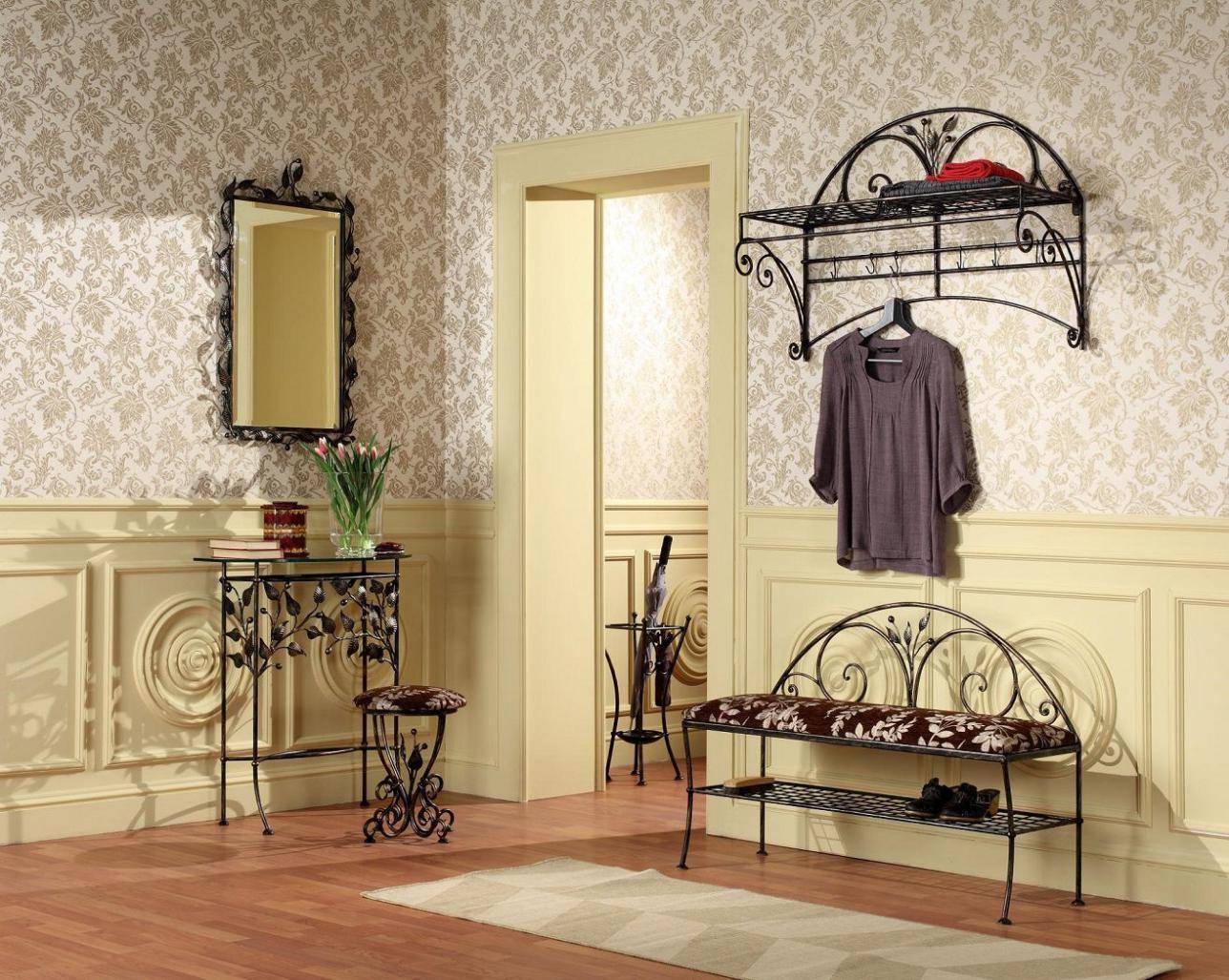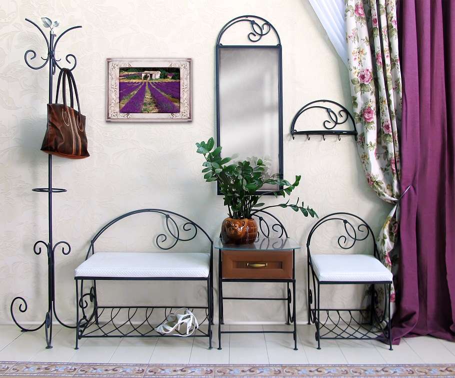В прихожей может быть использована металлическая консоль в виде пристеночного узкого стола с двумя или четырьмя коваными ножками. Дизайн прихожей украсят мягкие пуфики со встроенными полками из металла, кованые тумбочки. Из металла можно изготовить ключницу, галошницу. Если к деревянной тумбочке добавить каркас, разнообразный декор, ножки, получится интересное сочетание с созданием эффекта и уюта. Кованые изделия придадут прихожей долголетнюю изысканность, что даже у внуков владельцев не появится желание ее поменять.