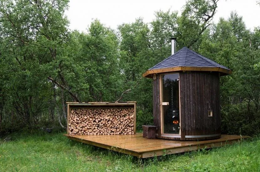 На маленькой террасе уместилась сауна и заботливо подготовленная поленница. Идеальный вариант для маленького участка.Источник pinterest.com